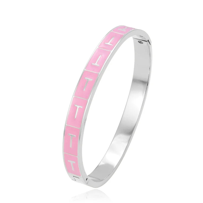 Um toque de cor na paisagem da elegância. O Bracelete Monaco é o equilíbrio perfeito entre a geometria clássica e a feminilidade moderna. Inspirado na energia vibrante e no luxo descontraído da Riviera, seu esmalte rosa dança sobre o metal polido, criando uma peça que é ao mesmo tempo divertida e inegavelmente chique. É o detalhe que transforma o comum em extraordinário, a assinatura de uma mulher que vive a vida em cores.