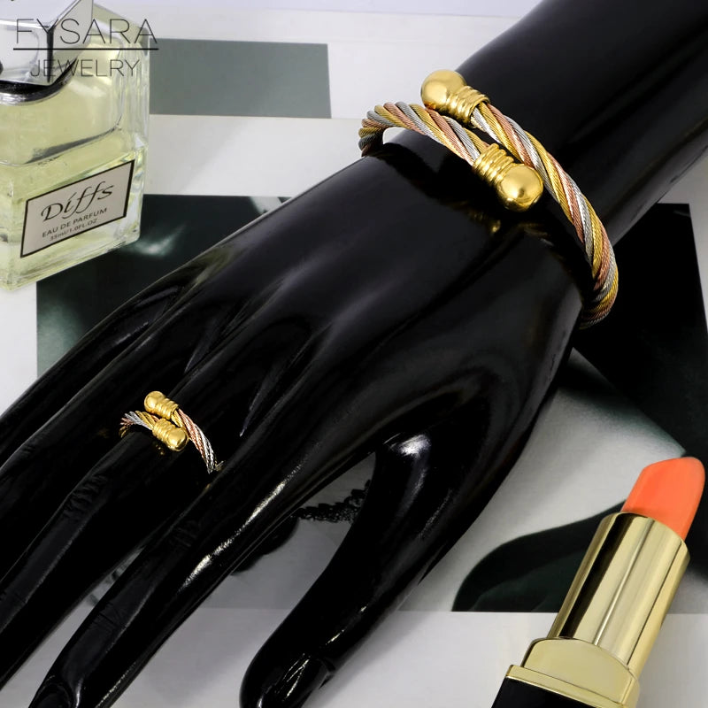 Na confluência de três caminhos, nasce a força. O Conjunto Trindade é a materialização da união: três fios de aço, em tons distintos, se entrelaçam para criar uma peça de poder inquestionável. Seu design, inspirado na robustez dos cabos de aço e na elegância dos metais nobres, é um tributo à resiliência. É o adorno de quem entende que a verdadeira elegância não está em uma única cor, mas na harmonia do todo.
