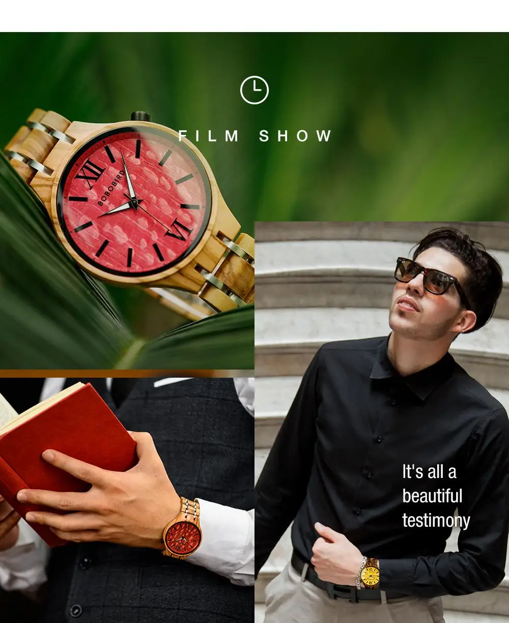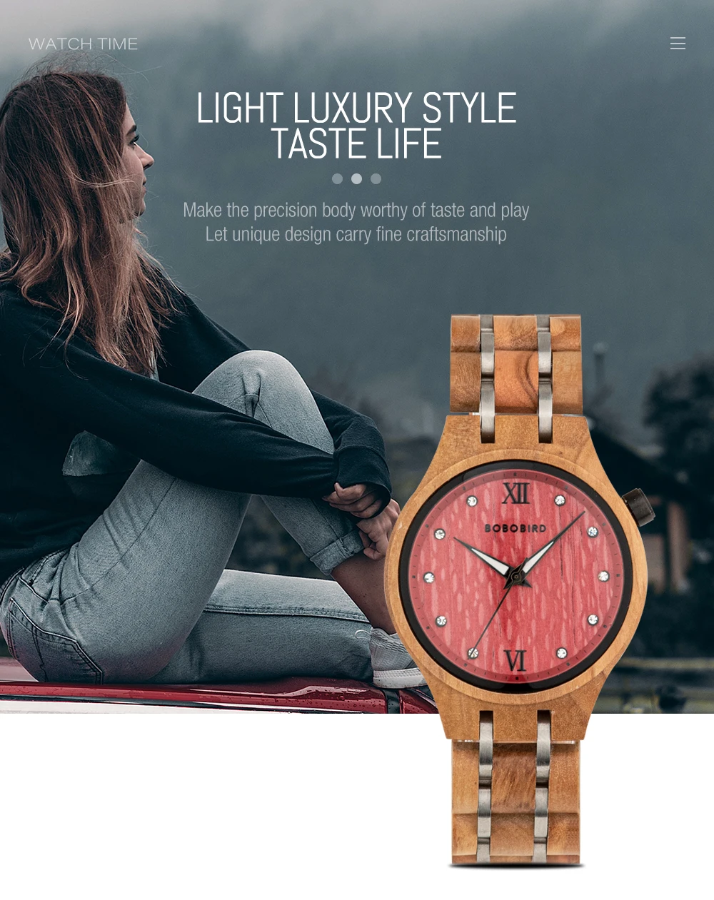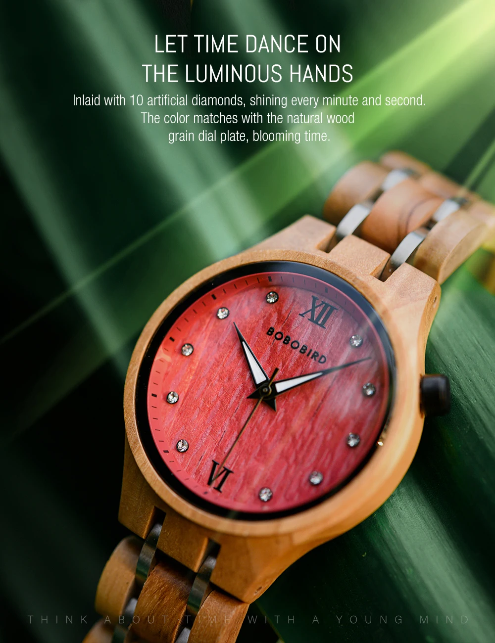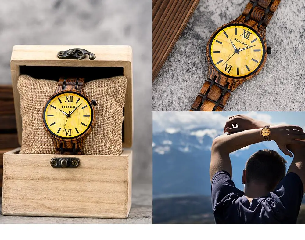 O mostrador, com sua textura orgânica e numerais romanos clássicos, é um tributo à passagem do tempo de forma elegante e serena. À noite, os ponteiros luminosos ganham vida, um detalhe sutil que assegura a funcionalidade sem sacrificar o estilo. A pulseira, composta por elos de madeira polida e detalhes em aço, oferece um conforto inigualável e um ajuste perfeito ao pulso.
