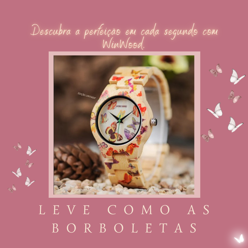 O tempo não precisa ser linear; pode ser um voo. O Relógio Papillon, da nossa coleção TERRA, captura a beleza efêmera da natureza e a eterniza em seu pulso. Cada detalhe, da madeira clara finamente polida à delicada estampa de borboletas, transforma este relógio em uma obra de arte usável. É uma peça que não apenas marca os segundos, mas celebra a liberdade, a transformação e a leveza de viver cada momento com poesia.