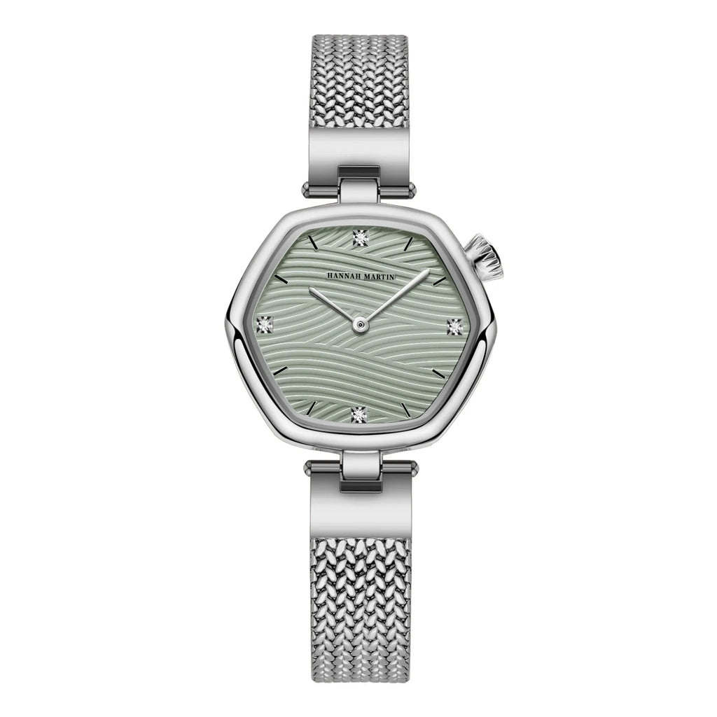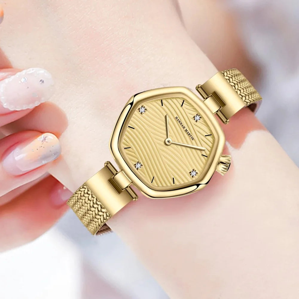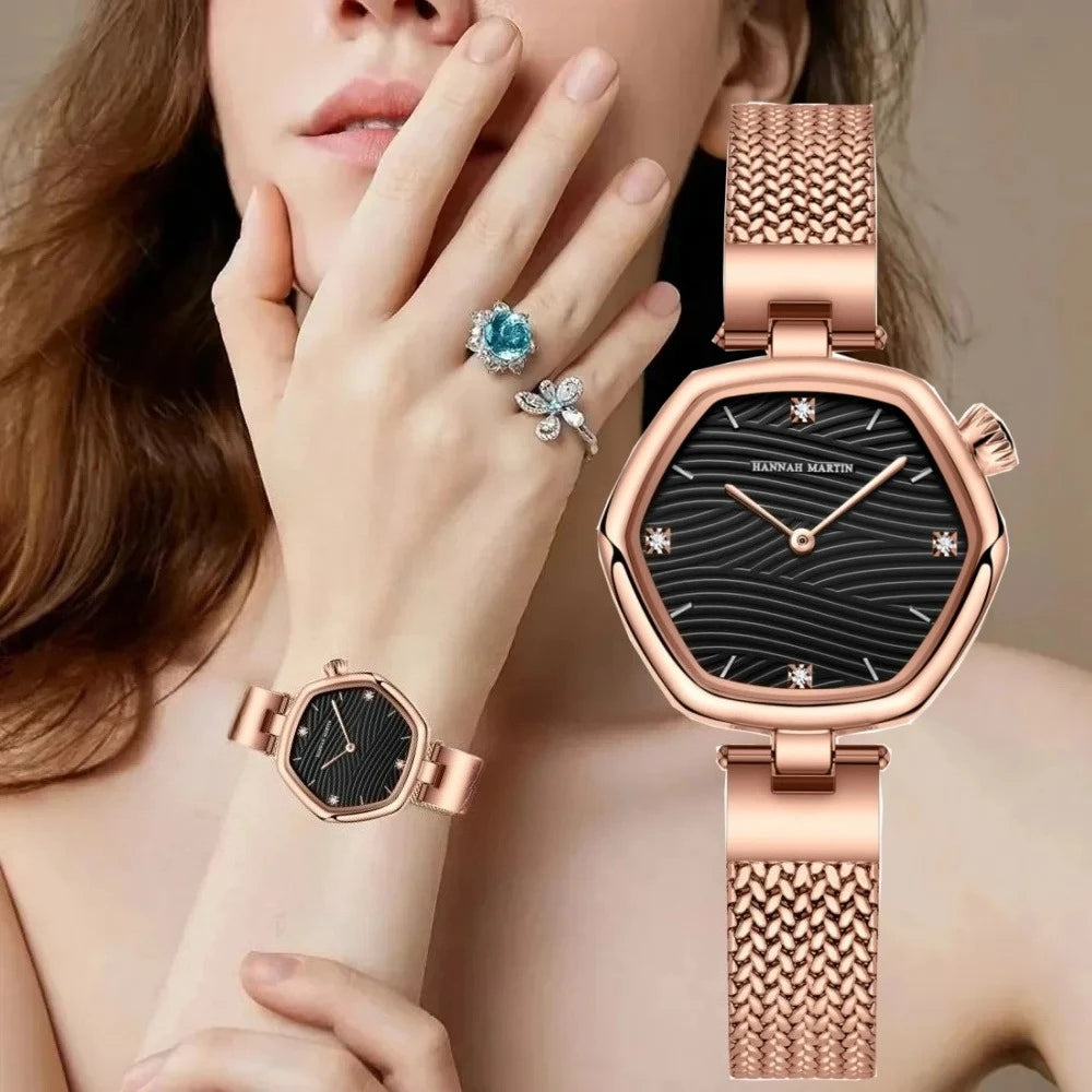 A força da geometria, a delicadeza do design. O Relógio Odessa foi criado para a mulher que aprecia a beleza nos ângulos, que entende o poder de uma forma inesperada. Sua caixa hexagonal quebra a monotonia do redondo, criando um ponto focal de ousadia e sofisticação. O mostrador, com sua textura hipnótica, e a pulseira em malha fina completam uma peça que não é apenas um relógio, mas uma joia arquitetônica no seu pulso.