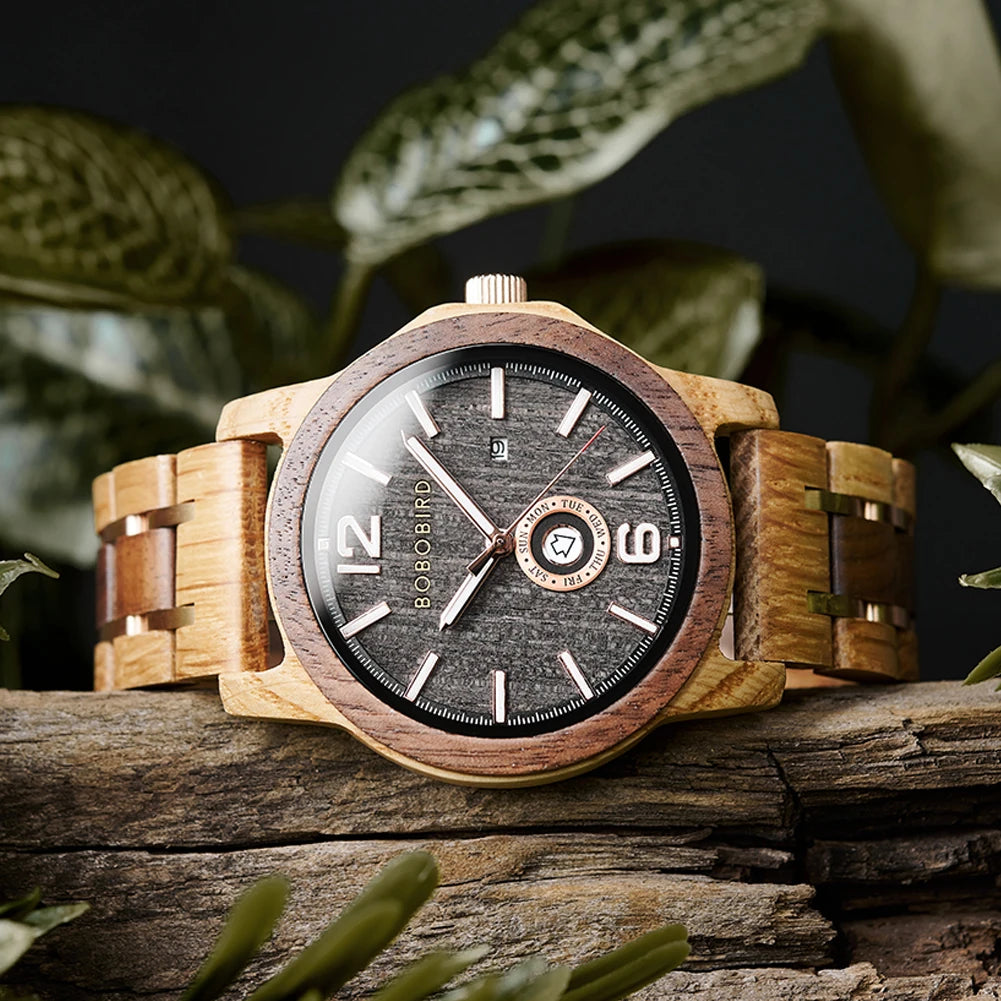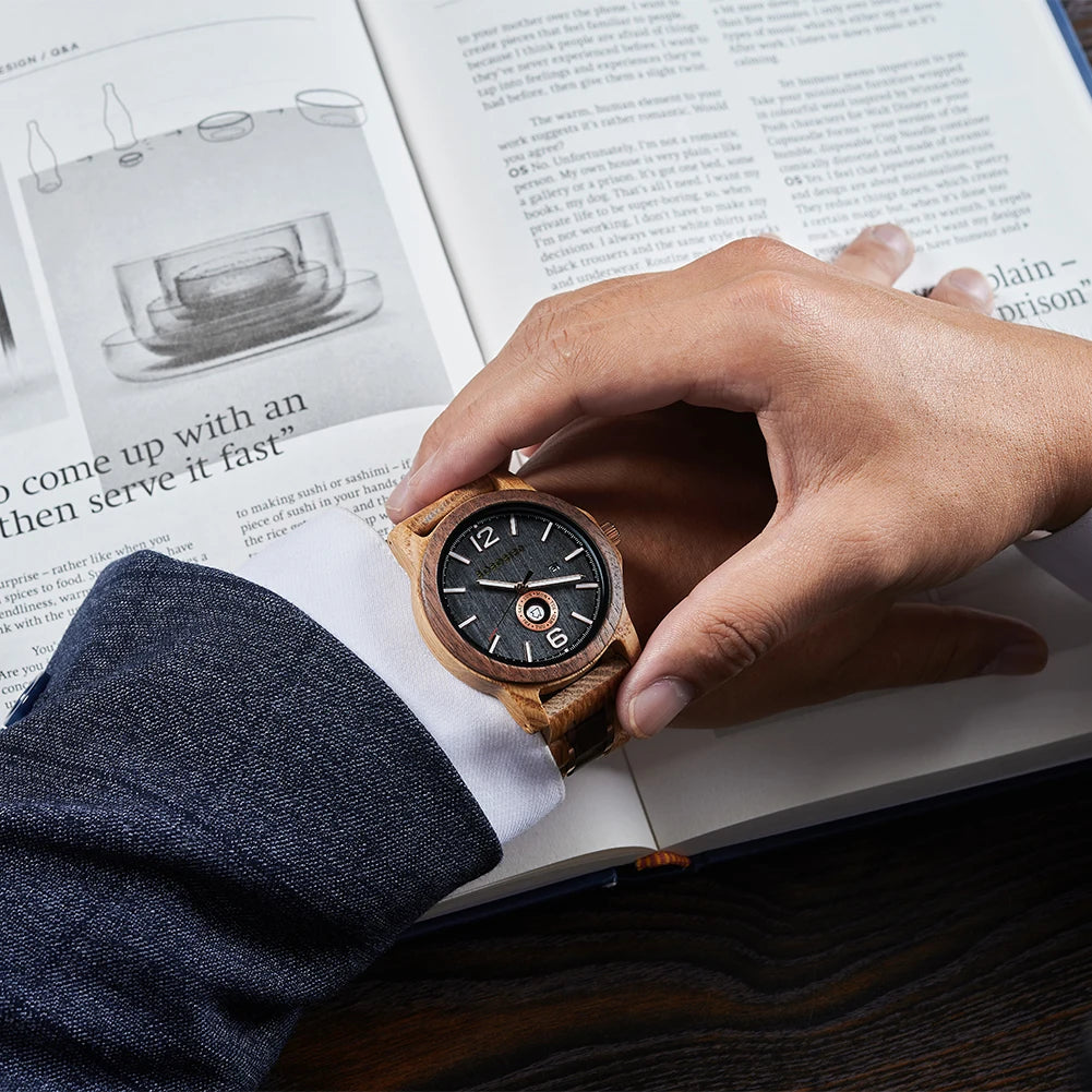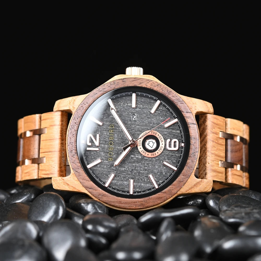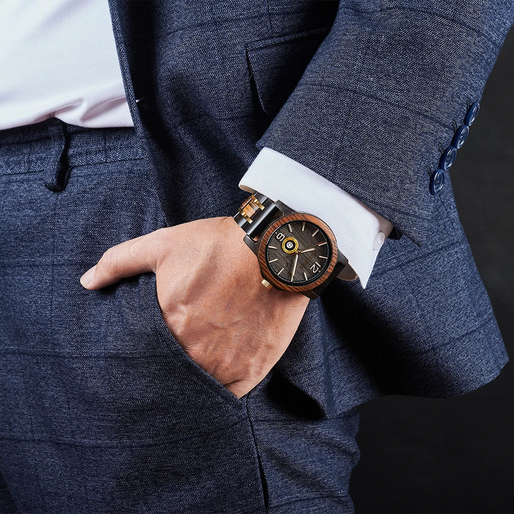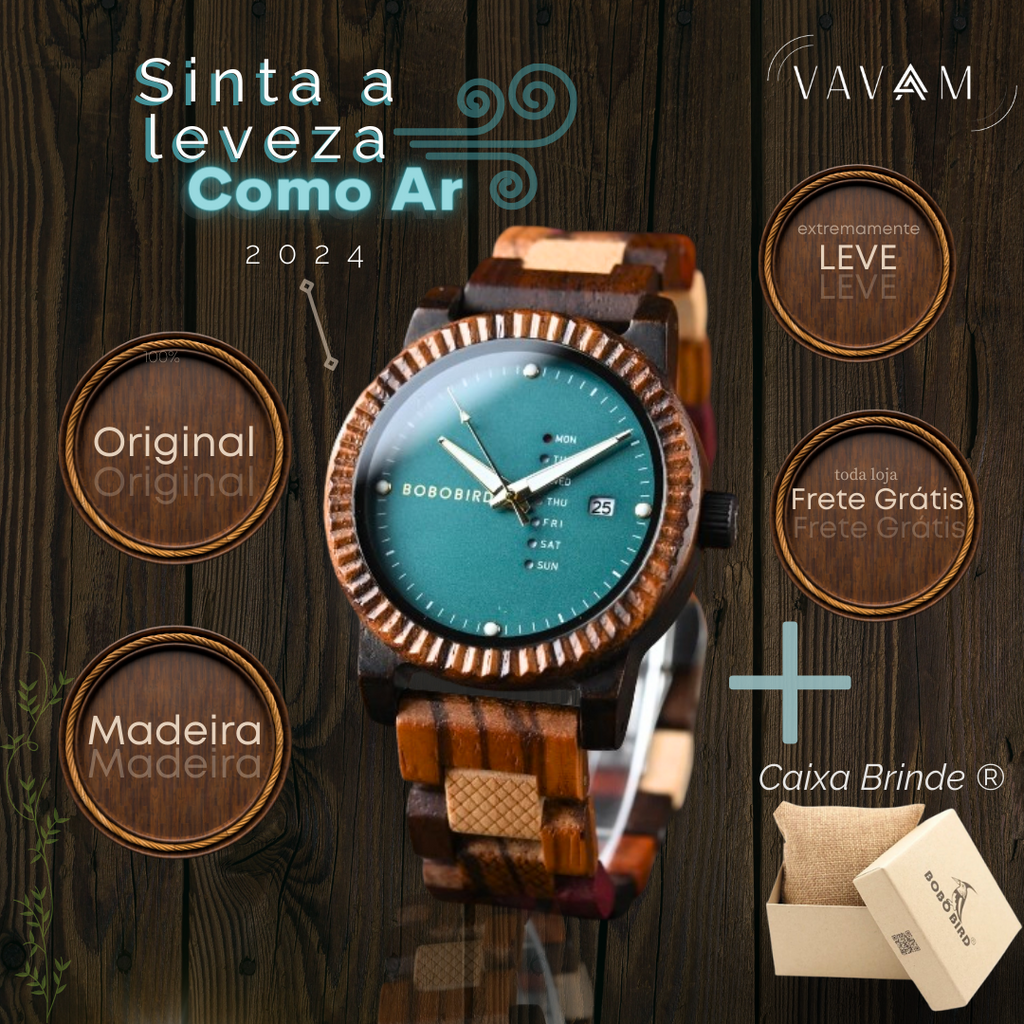 A leveza do relógio reflete o equilíbrio perfeito entre estilo e conforto, enquanto a escolha da madeira destaca sua conexão com a natureza. Cada detalhe é projetado para oferecer uma experiência exclusiva, transmitindo uma sensação de autoridade e sofisticação.