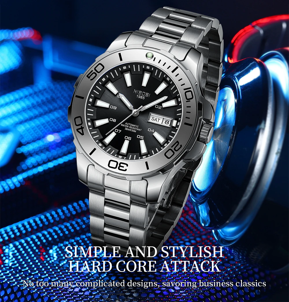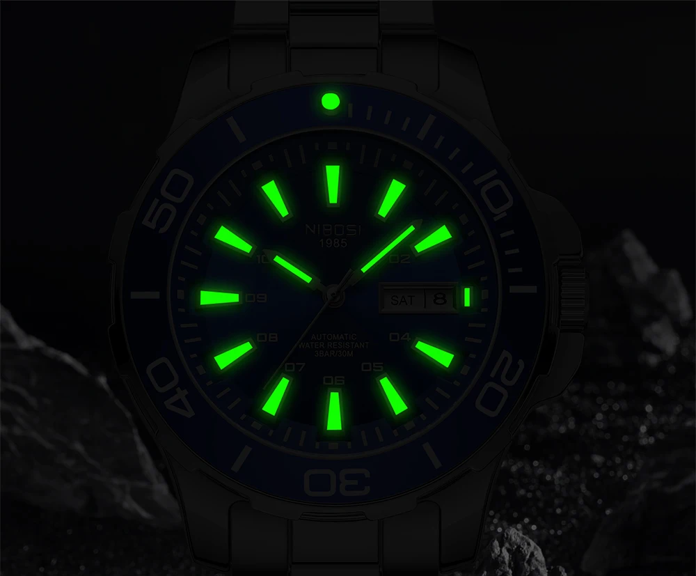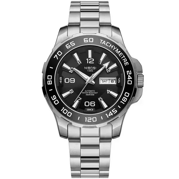 Materiais Premium: Caixa e pulseira em aço inoxidável, vidro Hardlex resistente, fecho oculto e movimento automático de alta precisão.